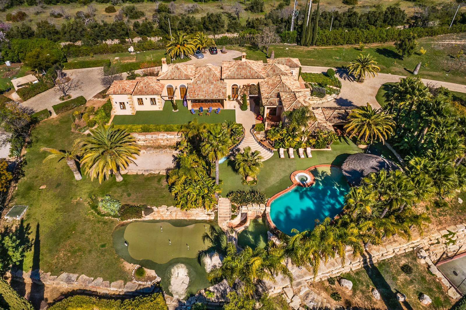 Beyond the court, the grounds offer a wide range of outdoor spaces, from a heated infinity pool and jacuzzi to shaded terraces and a peaceful Japanese garden with its waterfall and carp lake. There’s a boules court, putting green and plenty of room for garden games, while the outdoor kitchen and cabana invite long, sociable evenings. With its balance of activity and tranquillity, Vistas Algarve is an ideal setting for an easy-going, sun-filled escape.